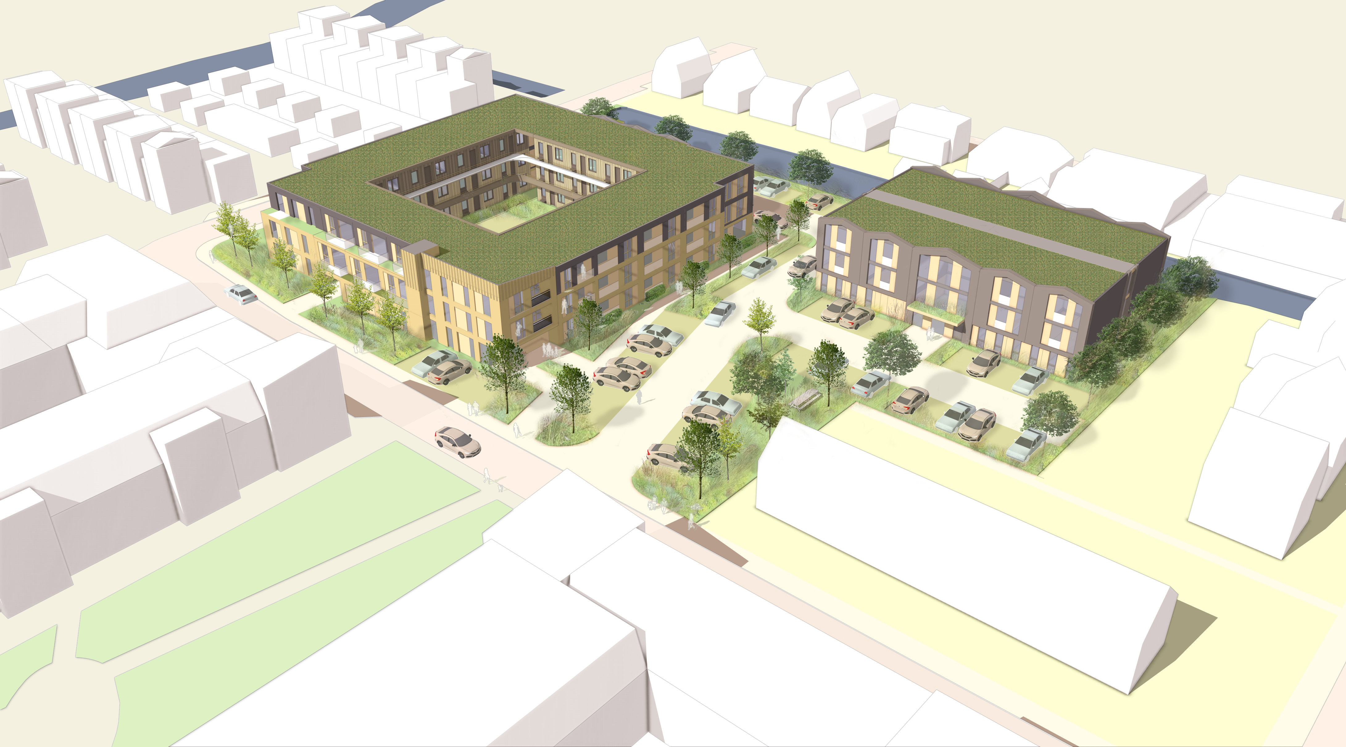 Een nieuwbouwlocatie waarbij appartementen worden gecombineerd met zorgwoningen.